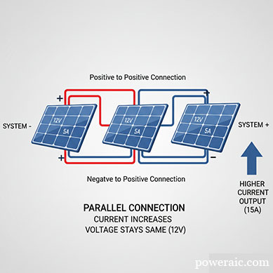 • In a series connection, the positive terminal of one panel is connected to the negative terminal of the next.