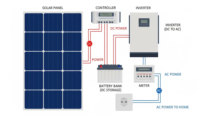 It shows how to connect panels, batteries, charge controller, and inverter safely and efficiently.